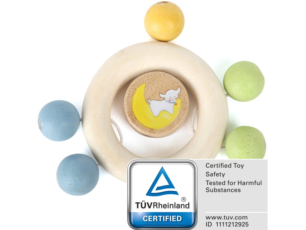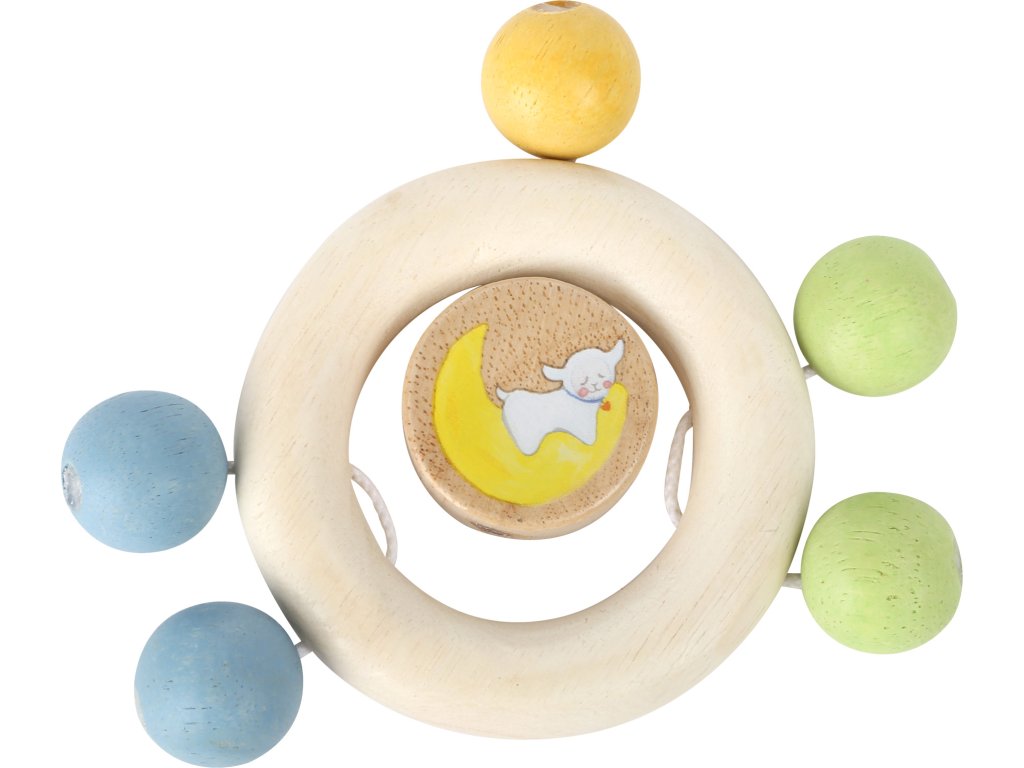 Dřevěný kroužek dobře padnoucí do dětských rukou je opatřen korálky. Při zatřesení korálky o kroužek chrastí. Vyrobeno z vysoce kvalitního dřeva a je lakováno lakem odolným proti slinám. Hlavní vlastnosti: rozvíjí motorické dovednosti a sluchCertifikát zdravotní nezávadnosti - bez toxických látek