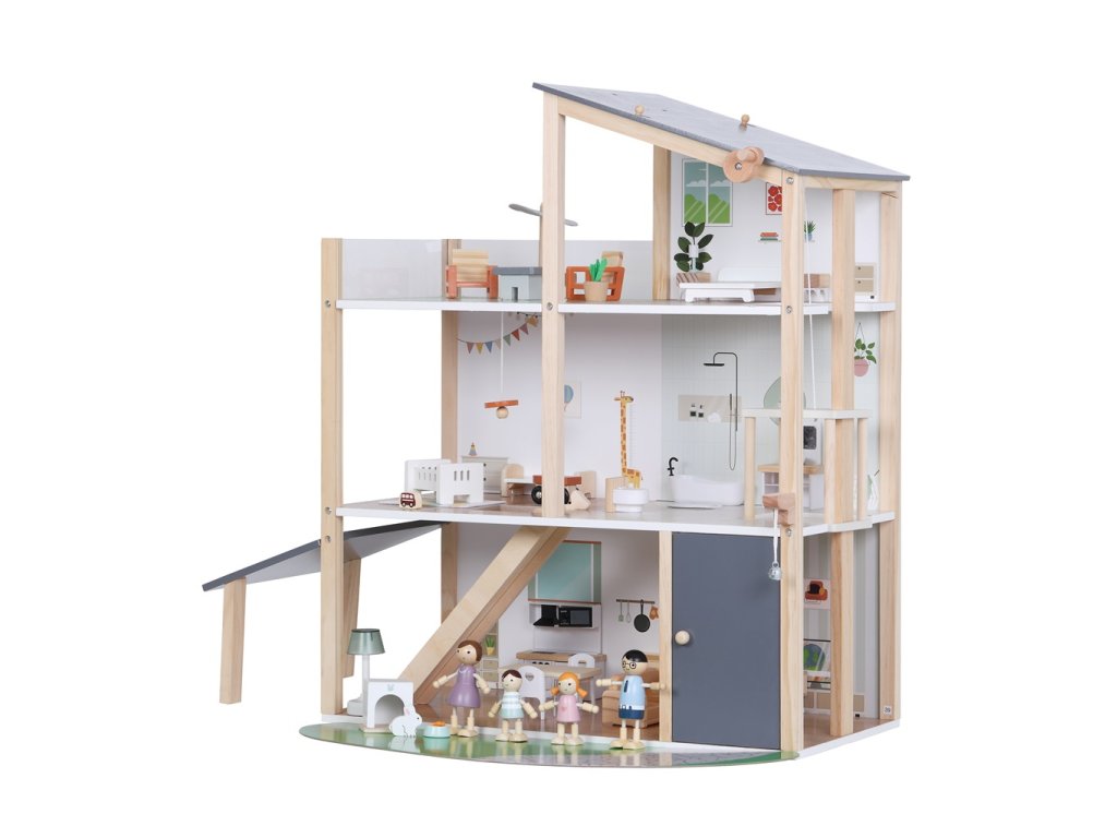 Vítejte v domečku, kde se bydlí jedna radost! Prostorný dřevěný domek je plně vybavený nábytkem i doplňky. Najdete v něm prostornou kuchyni propojenou s útulným obývacím pokojem, stylovou koupelnu s vanou, dětský pokojíček, ložnici i luxusní střešní terasu pro chvíle pohody. A aby toho nebylo málo, nechybí ani výtah. Zatočte kličkou a vyvezte rodinku až do druhého patra. Součástí sady je roztomilý domácí mazlíček králíček s vlastním domečkem a čtyřčlenná rodina připravená zabydlet se a začít psát svůj příběh. Děti si při hře rozvíjejí fantazii, sociální dovednosti i smysl pro detail. A hlavně se výborně baví! Hravý design, jemné barvy spolu s kvalitním provedením dělají z této hračky krásný doplněk každého pokojíčku nebo herny. Domeček je dodáván v rozloženém stavu a vyžaduje montáž. Návod k sestavení je součástí balení. Hlavní vlastnosti: 41 dílůplně vybavený dřevěný domeček se 4 figurkami rodinypodporuje fantazii, tvořivost a hru na rolevede k představivé hřekvalitní zpracování a atraktivní designdodáváno v rozloženém stavu, nutná montážnávod k sestavení je součástí balenívhodné pro děti od 3 let