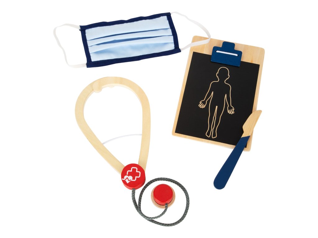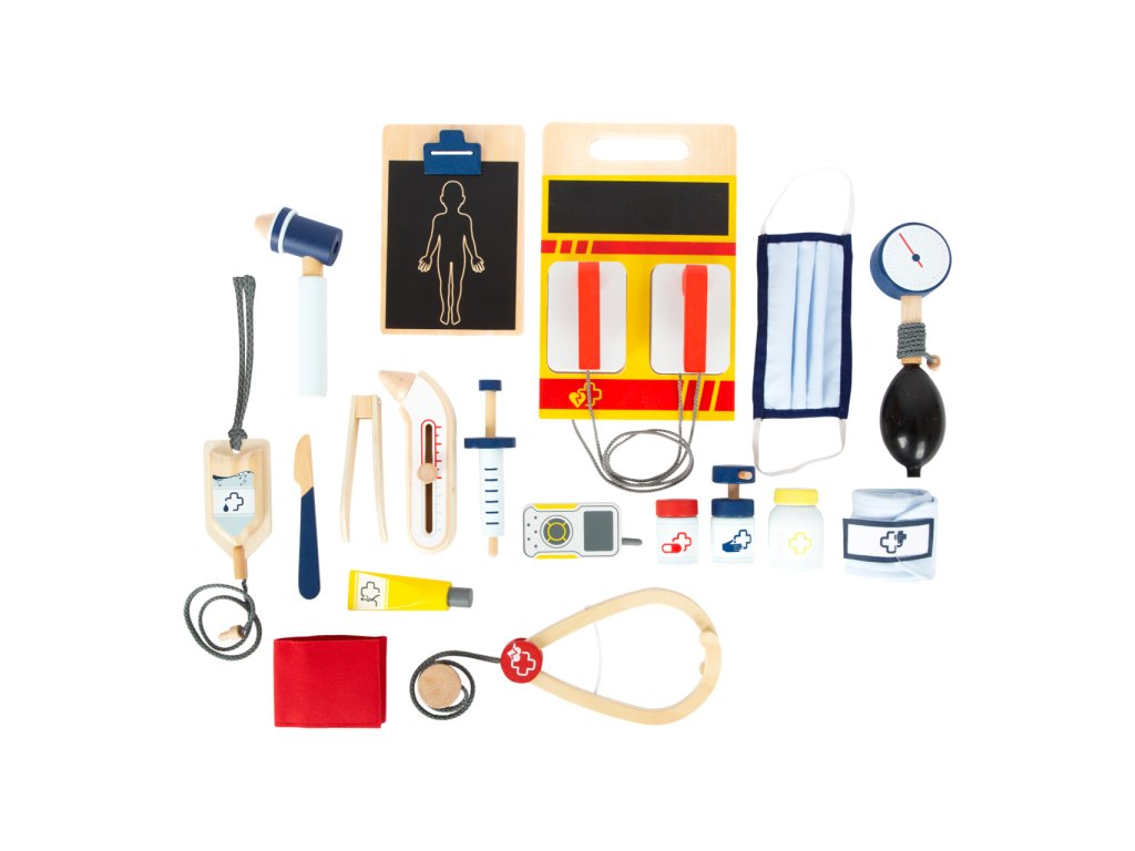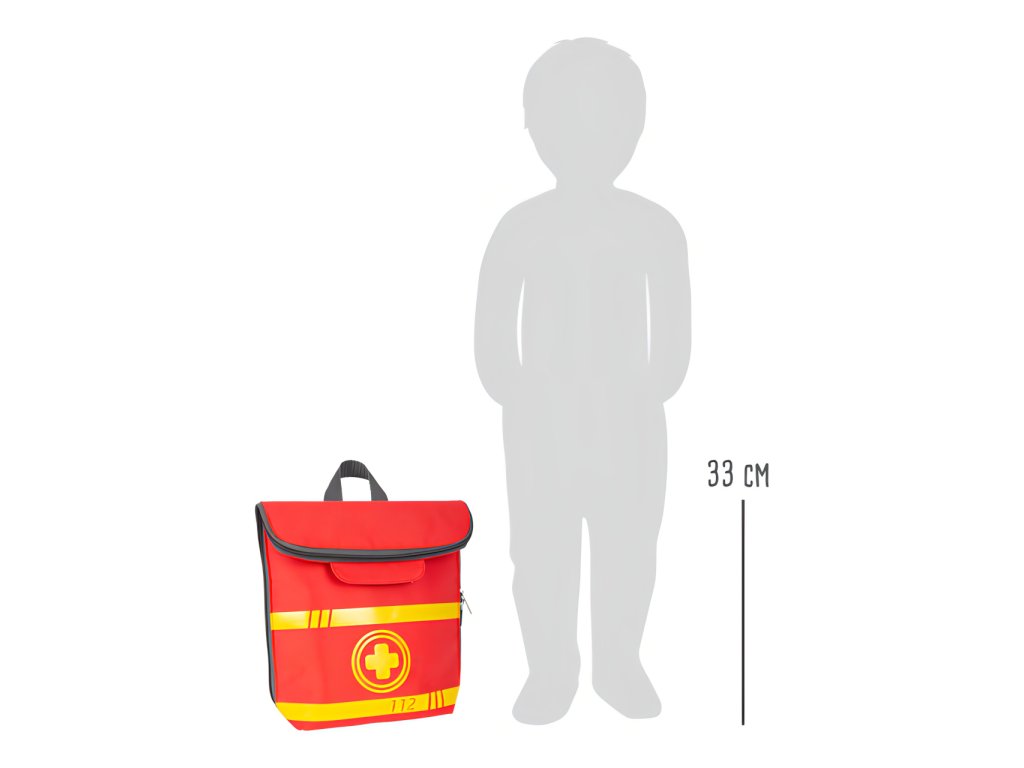 Vše pro naléhavé případy! Tento realistický batoh pro záchranáře má jasné barvy, nastavitelné popruhy a mladí záchranáři v něm najdou všechny „opravdové“ lékařské pomůcky. Dvojitý zip a uvnitř elastické kapsy nabízí mnoho úložného prostoru a rychlý přístup k záchranářským pomůckám z pevného dřeva. Nejlepšími doplňky jsou zřejmě tlakoměr s manžetou a balónkem, otoskop s lupou a defibrilátor s tabulkou pro křídu. Tento inovativní a obsáhlý set lékařských hraček obsahuje mnoho „opravdových“ lékařských nástrojů a přístrojů, s kterými si děti opravdu vyhrají, to vše v jednom batohu. Dále v batohu najdete teploměr, dětské textilní roušky, ampule s otvorem pro vložení stříkačky pro případ nouze, dezinfekční sprej s pumpičkou, infúzi, náplasti na suchý zip, stetoskop, injekční stříkačku s pohyblivým mechanismem, skalpel, pinzetu a rádio. S těmito pevnými hračkami mohou děti objevovat a zkoušet, jaké je to být záchranářem. Ilustrace na lékařských pomůckách dětem poradí rozeznat nástroje a také jim možná zjednoduší jejich použití. Hlavní vlastnosti:tlakoměr s manžetou a balónkem, lze také použít pro zajištění infúzeotoskop s opravdovou lupouteploměr s nastavitelnou teplotouznovu použitelné a pratelné dětské textilní rouškydefibrilátor s křídou pro zaznamenání srdečního tepudalší vybavení: ampule s otvorem pro vložení stříkačky pro případ nouze, dezinfekční sprej s pumpičkou, náplasti na suchý zip, lahvička na léky se šroubovatelným víčkem, injekční stříkačka s pohyblivým mechanismem, stetoskop, skalpel Ocenění hračky:ToyAward 2022