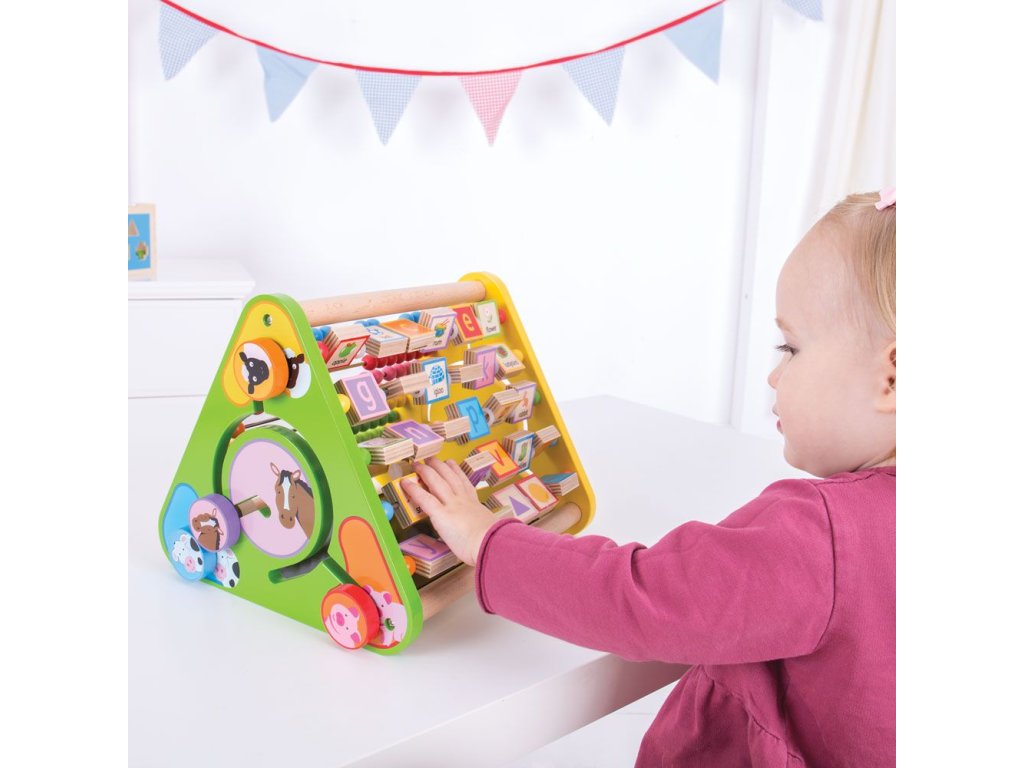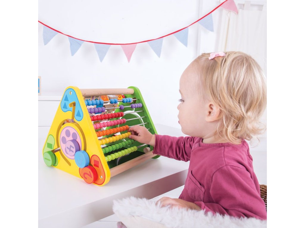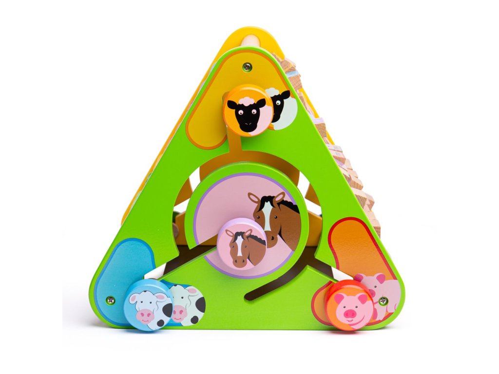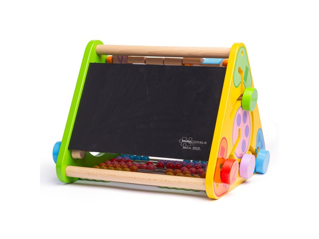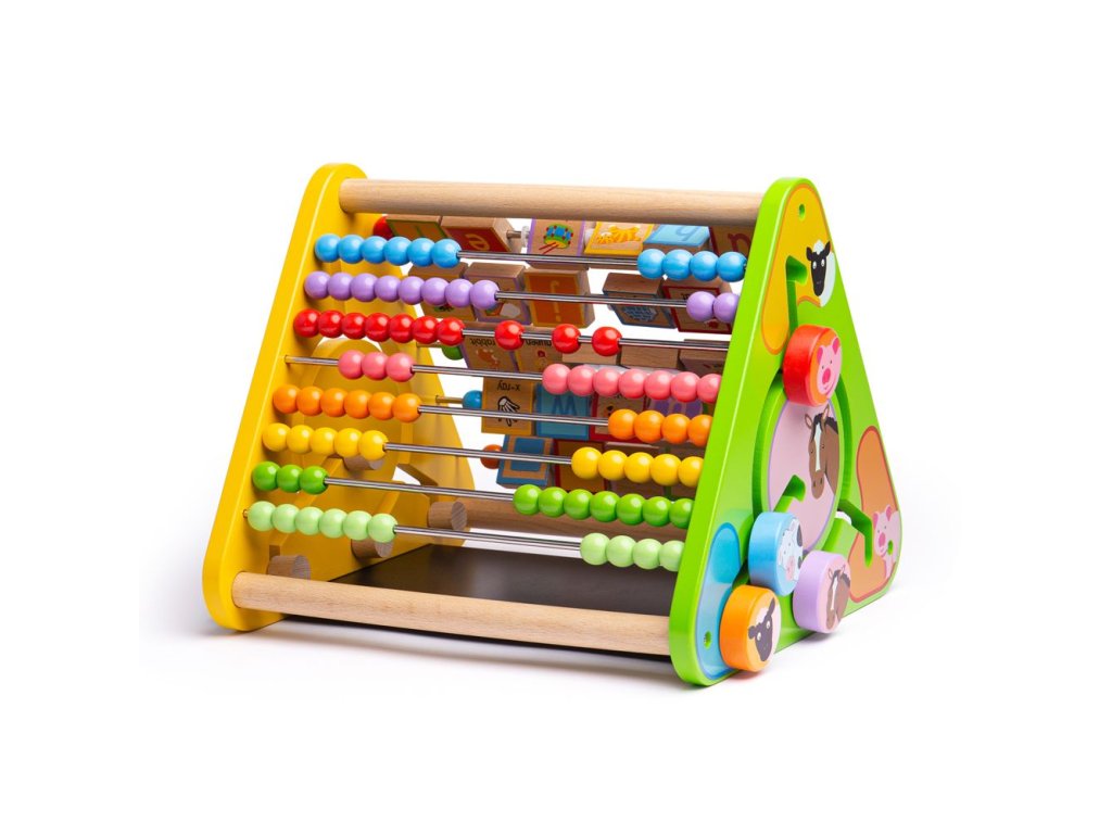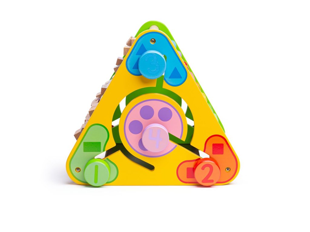 Motorický trojúhelník ideální na doma i na cesty. Obsahuje pět různých aktivit - počítadlo, kreslící tabulku, anglické názvy předmětů podle abecedy včetně obrázků, rozlišování barev a čísel a rozlišování zvířat. Všechny části trojúhelníků jsou pevné, nehrozí proto ztracení žádného kusu. Rozvíjí obratnost a koordinaci. Vyrobeno z vysoce kvalitních, zodpovědně získaných materiálů. Splňuje aktuální evropské bezpečnostní normy. Hlavní vlastnosti: 5 různých aktivitrozvíjí obratnost a koordinacirobustní a pevná konstrukcepestrobarevný design
