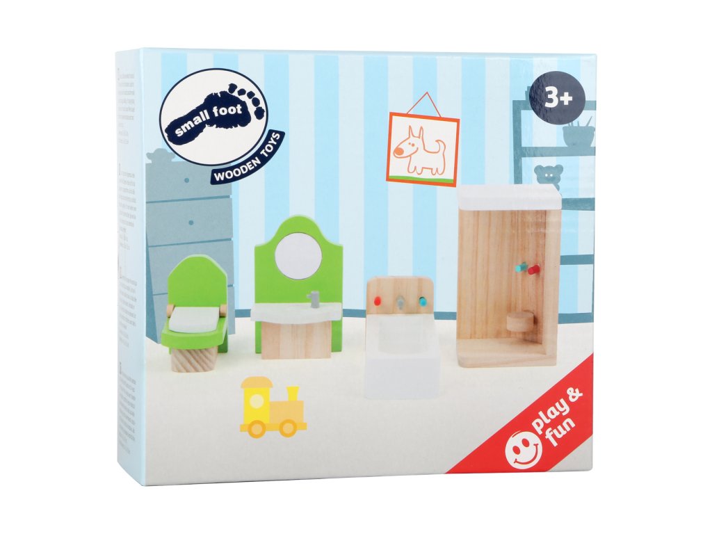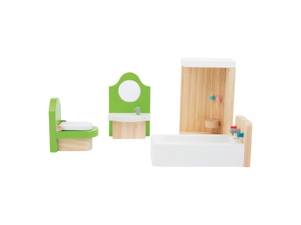 Poškozený obal. Nové zboží bez závad. Tato 4 dílná sada vybavení do koupelny má velikost pro ohýbací panenky do 12 cm. Je vyrobena z masivního dřeva pro dlouhou životnost. Hlavní vlastnosti: při hře tato sada probouzí fantazii a procvičuje jemnou motoriku
