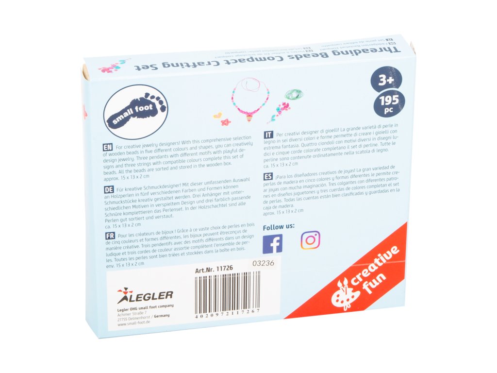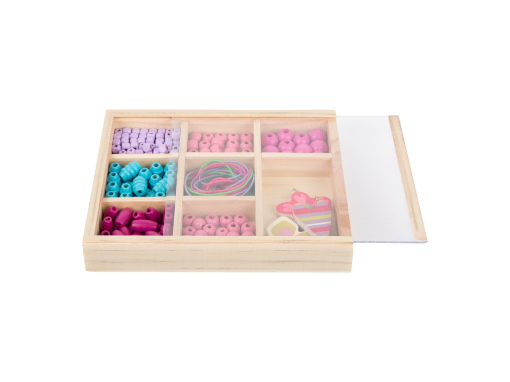 Vyrobte si své šperky s touto sadou korálků v pěti různých barvách a tvarech. Korálkový set doplňují tři přívěsky s různými motivy v hravém designu a tři barevně sladěné šňůry. Vše je uloženo v dřevěné krabici. Navlékáním korálků je podporována jemná motorika dětí. Hlavní vlastnosti: pět různých barev a tvarůpodporuje jemnou motoriku