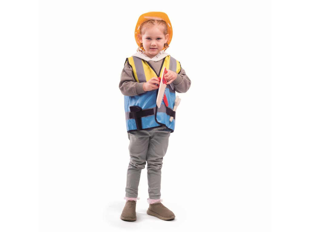 Na staveništi je dnes rušno. Malí stavitelé si mohou obléknout dětský kostým stavitele a pustit se do práce při pokládání cihel, míchání cementu a mnoha dalších činnost, vždy je co dělat. Součástí této dětské sady je fluorescenční žluto-modrá vesta, dřevěná pila, šroubovák, hasák, kladivo, ochranné brýle a průkaz. Přilba stavitele je k dispozici samostatně. Kostým je vhodný pro děti ve věku 3-5 let. Bunda měří 40,5 cm na šířku a 44 cm na výšku. Zapínání je na suché zipy pro snadné oblékání a svlékání kostýmu. Kostým testován podle nejnovějších předpisů EN71. Hlavní vlastnosti: včetně příslušenstvívhodné pro děti od 3 do 5 letnápadité a detailní zpracování