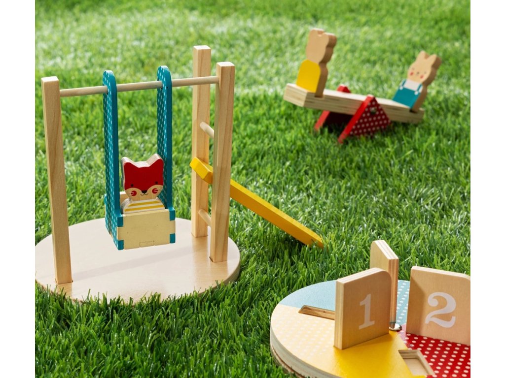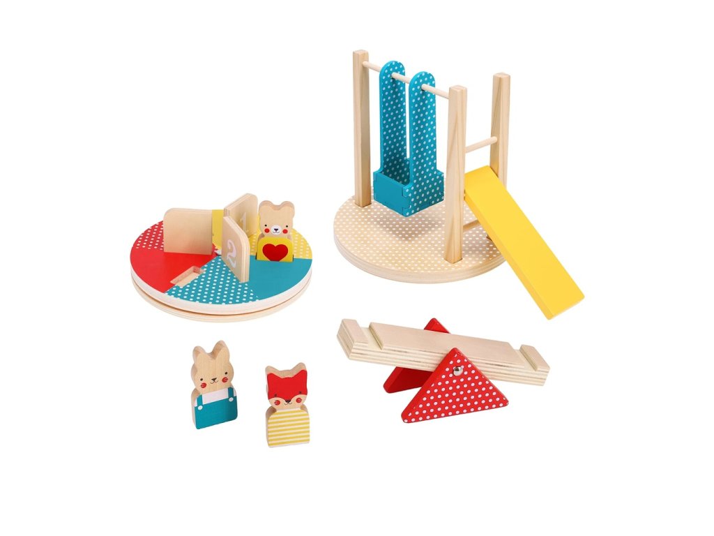 Pojďte si pohrát na hřiště se zvířecími kamarády liškou, medvědem a zajíčkem! Díky zábavným atrakcím včetně kolotoče, houpačky a houpačky se skluzavkou a třem zvířecím postavičkám si děti užijí spoustu zábavy. Pohoupejte se na houpačkách, sjeďte ze skluzavky nebo se točte na kolotoči. Dřevěná sada zlepšuje jemnou motoriku, prohlubuje pochopení příčiny a následku, rozvíjí emoční vnímání a podporuje samostatné hraní. Je vyrobena z FSC® dřeva a FSC® papíru, obal je potištěn s využitím 75 % recyklovaných materiálů a je plně recyklovatelný. Obsah balení: houpačka se skluzavkou, houpačka, kolotoč, 3 postavičky zvířátek – liška, medvídek, zajíček. Hlavní vlastnosti: vyrobeno z FSC® dřeva a FSC® papíruplně recyklovatelný obalrozvíjí jemnou motoriku podporuje samostatné hraní vhodné od 3 let Značka a certifikát FSC® (Forest Stewardship Council) zaručuje, že dřevo, ze kterého byl produkt vyroben, nebylo vytěženo nelegálně a pochází z lesů obhospodařovaných šetrným či přírodě blízkým způsobem, ve kterém jsou dodržovány přísné environmentální a sociální požadavky. Značka FSC® na výrobku znamená, že svým nákupem pomáháte chránit lesy a podporujete šetrné, odpovědné či přírodě blízké hospodaření, díky kterému jsou naše lesy stabilnější, zdravější, mají přirozenou druhovou skladbu a lépe odolávají negativním následkům klimatických změn.
