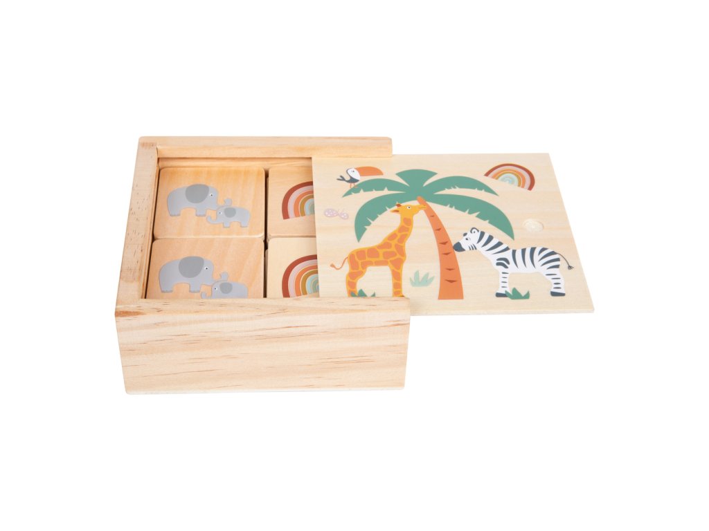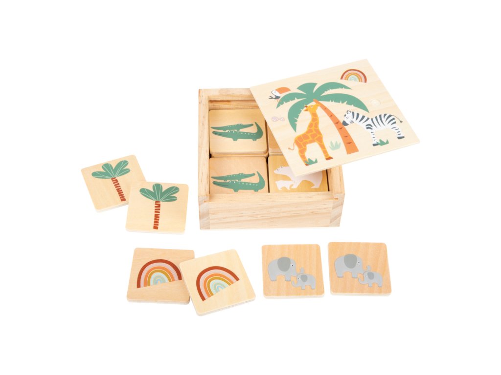 Safari přímo v dětském pokojíku! Abyste našli všech 14 dvojic obrázků budete potřebovat dobrou pamět a soustředěnost. Malé dřevěné dílky s krásnými ilustracemi safari v trendy barvách upoutají pozornost každého dítěte. Budou se chtít dozvědět více o tomto zvířecím světe. Nejen, že si děti při hraní pexesa procvičí pamět, ale také se naučí pojmenovat nová zvířata. Pexeso je uloženo v dřevěném boxu, takže je perfektní i na cesty. Hlavní vlastnosti: klasická paměťová hra s motivy z říše zvířathra pro 2 – 4 hráčeideální na cesty: lze snadno uložit do dřevěné krabičky s posuvným víkemhravou formou trénuje soustředění a paměťové schopnostidděti se při hře učí o obyvatelích savany