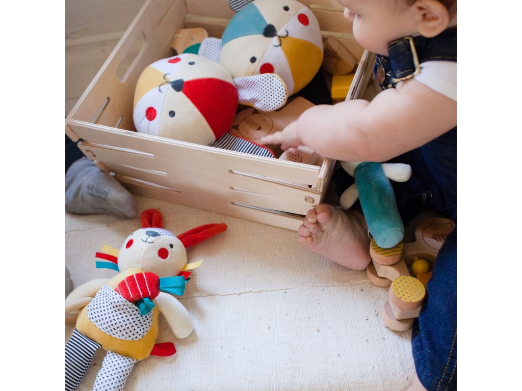 Textilní chrastítko pro děti od narození. Hlavní vlastnosti: Použity barvy na rostlinné bázi šetrné k životnímu prostředíVyrobeno z organické bavlny nejvyšší kvality, certifikováno GOTS
