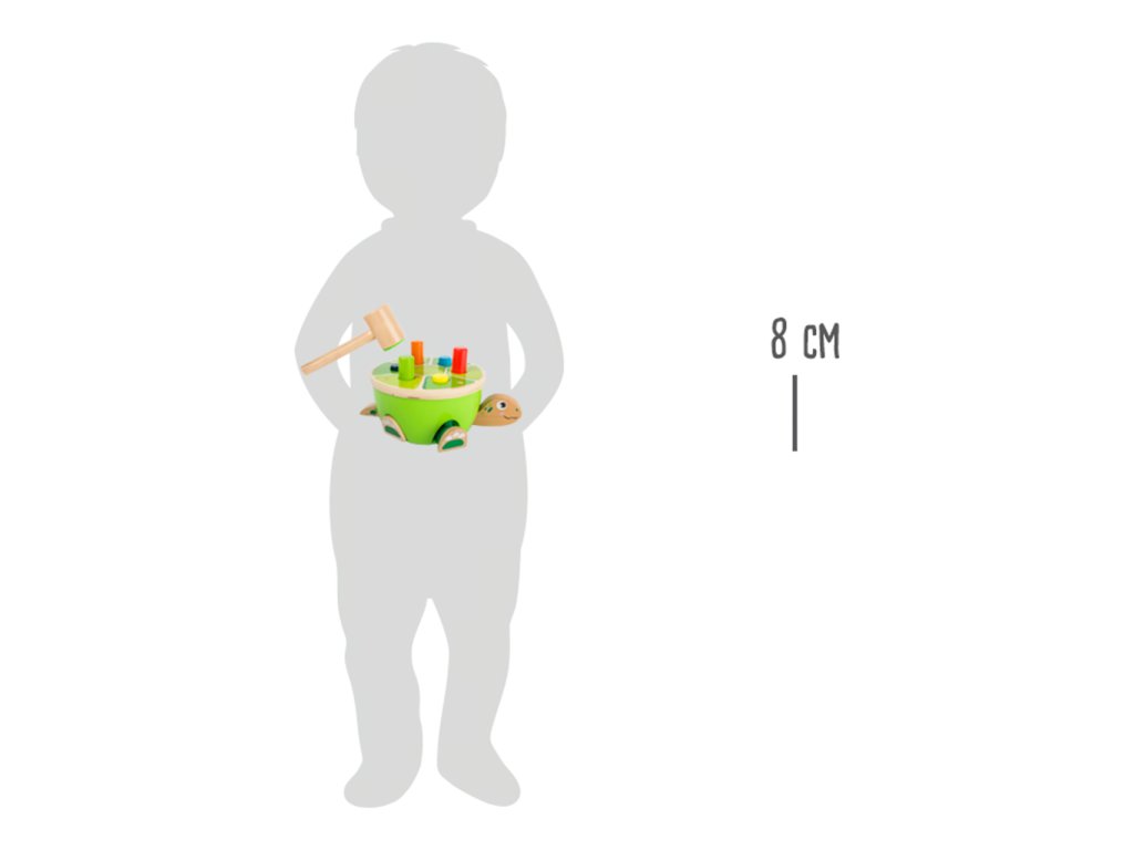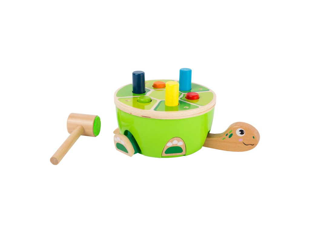 Želvy, dávejte si pozor! Tato originální zatloukačka zábavným způsobem rozvíjí dovednosti a soustředění našich nejmenších. Děti mohou prokázat jak svou obratnost tak svou přesnost. Dřevěné kladivo je opatřeno plstí pro tiché údery. Při úderu na jeden barevný dřevěný kolík se automaticky vysune další. Nohy, hlava a ocas želvy se natahují po úderu z každého kolíčku. Motorická hra, která bude bavit! Hlavní vlastnosti: rozvíjí dovednosti soustředěnítrénuje koordinaci ruka-oko a motorikuoriginální zatloukačka